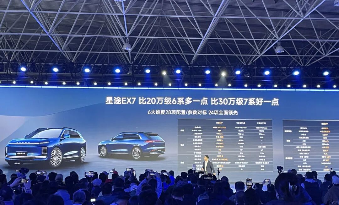 此外,当晚的活动现场还迎来了星途EX7盲订。整体来看,新车可谓集诸多亮点于一身,除了首发航空级EMB线控制动、首发AI灵犀智舱2.0外,星途EX7还搭载了飞鱼底盘3.0和雪豹四驱2.0,无疑是一款承载了奇瑞最新技术的重磅产品。据悉,星途EX7的固液混合电池版本也将于今年第四季度正式推出,值得期待。
