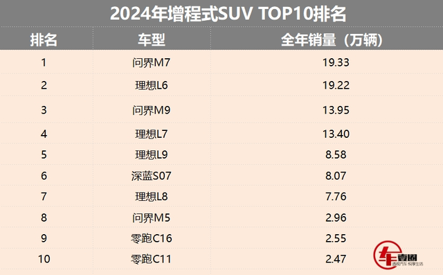 虽然在增程式SUV车型销量榜单上问界M9排在第三,但它可是50万元级高端SUV市场上的销冠,仅增程版车型2024年销量就达到了13.95万辆。