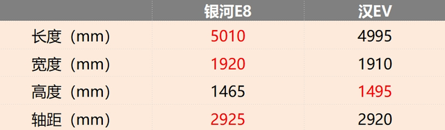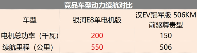 根据此前的申报信息显示,银河E8已经申报了两种电池续航版本,分别搭载76kWh和62kWh的动力电池组,CLTC工况在纯电续航里程为665公里和550公里。相比汉EV冠军版506公里起步的续航来说,银河E8显然更有优势。