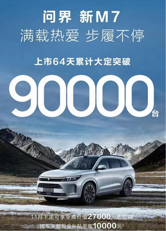 而在10月,问界新M7的交付量达到了10547台,是同级别为数不多单月销量破万的产品。上市64天,大定订单也突破9万台大关。