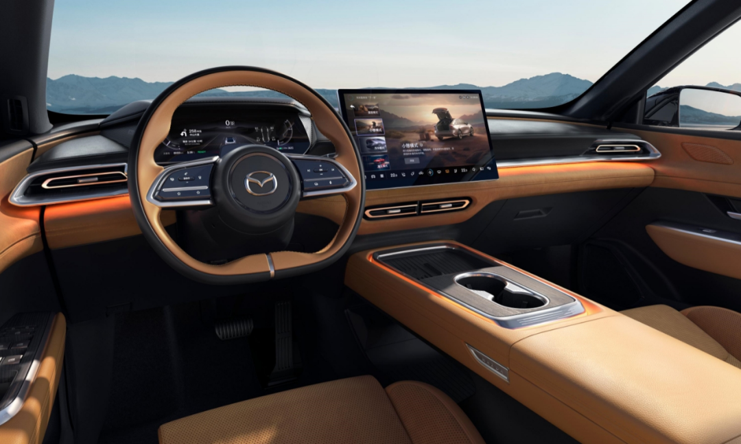 内饰方面,MAZDA EZ-6采用了环抱式布局,车内绝大多数功能都集中在中控屏之中,整体风格向电动化靠拢。新车使用了更加高级材质,并配备亚光镀铬饰件装饰,营造出高档次感。环抱式的设计不仅美观,更强调驾驶者与车辆的互动,体现了马自达“人马一体”的造车理念。
