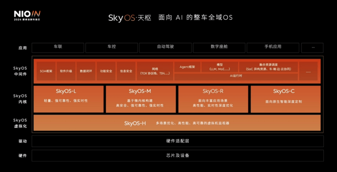 与神玑NX9031芯片同时发布的,还有蔚来历时四年研发、投入超过23000人每月的整车全域操作系统——SkyOS·天枢。该系统面向AI时代,集高带宽、低时延、大算力与异构硬件、跨域融合、灵活持续进化、高可靠性、信息安全七大特性于一身。