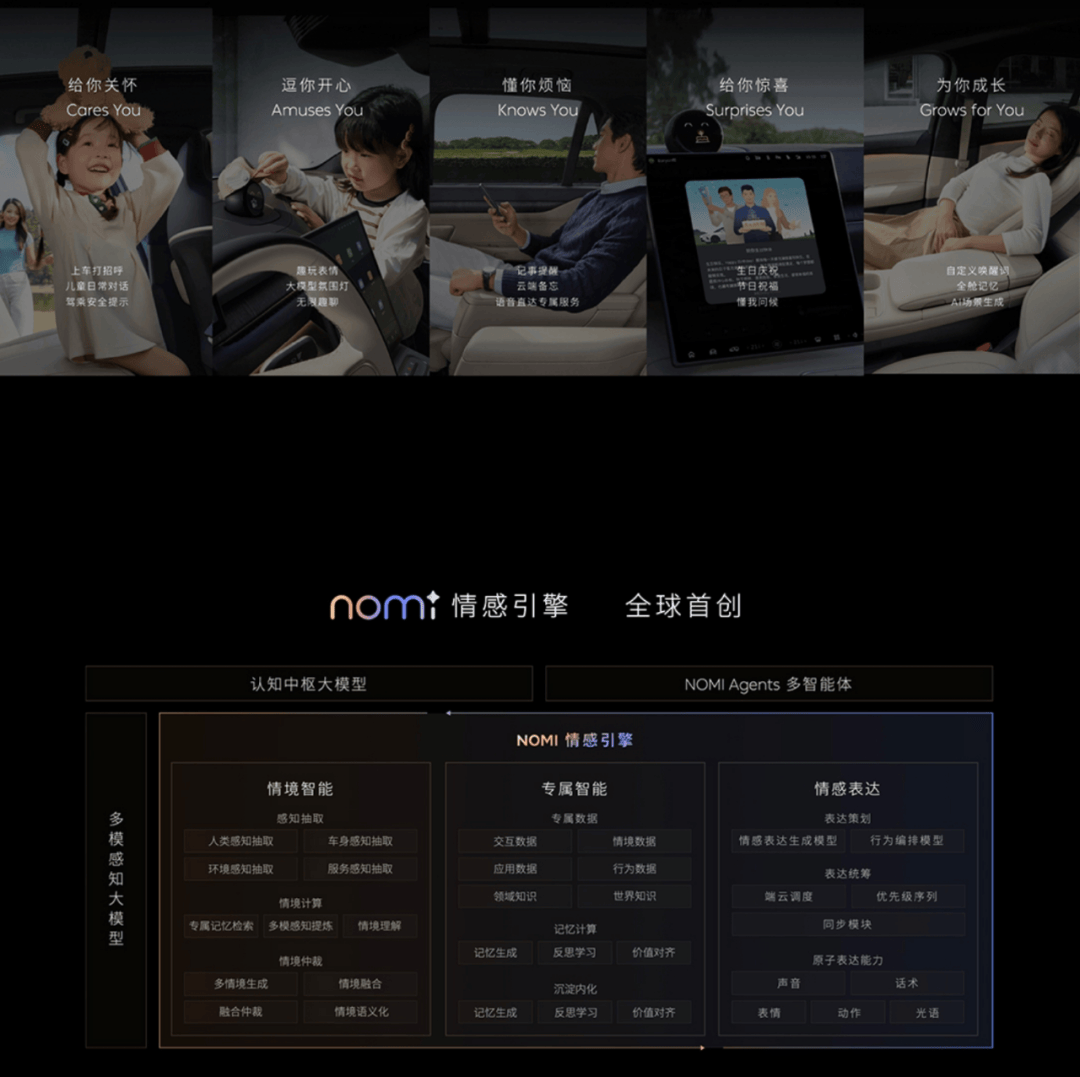 同时,蔚来还发布了NOMI的六大智能体:停车助手、守卫摘要、服务管家、探索发现、旅行回忆以及NOMI DJ的多智能体,将在Banyan 3及后续版本陆续推送。“情感引擎”是NOMI GPT最核心的技术之一,能够带来了情境智能、专属智能和情感表达3个基石能力。在情感引擎的驱动下,NOMI可以更好地与用户共情,带去关怀、惊喜与安心,成为真正的情感伙伴。