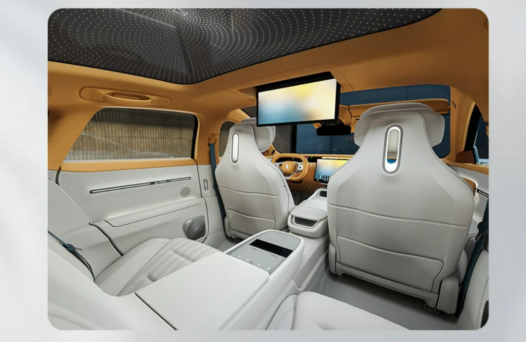 进入车内,阿维塔012的座舱造型简约而不失豪华感。座舱内采用温暖座舱颜色并搭配星辉天幕,营造出一种温馨而舒适的氛围。车内实体按键被大量减少,仅保留必要的一些常用按键,这种设计不仅提升了整车的科技感,也使得内饰更加简洁大方。座椅采用纯白设计,并可能换上更高级的皮革材质,搭配黄色的顶棚设计,展现出极致的奢华感。