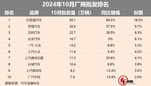 从10月份排行榜来看,比亚迪毫无悬念以50.1万辆,同比增幅66.2%的好成绩再次拿下了销冠位置。紧随其后的奇瑞汽车10月份批发量达到了销量26.5万辆,同比增速37.5%,位列第二。而吉利汽车同样不甘示弱,批发量为22.7万辆,同比增长28%,排在了第三名。虽然长安汽车10月份同比批发量没有增长,不过也交出了16.7万辆的成绩,表现同样抢眼。