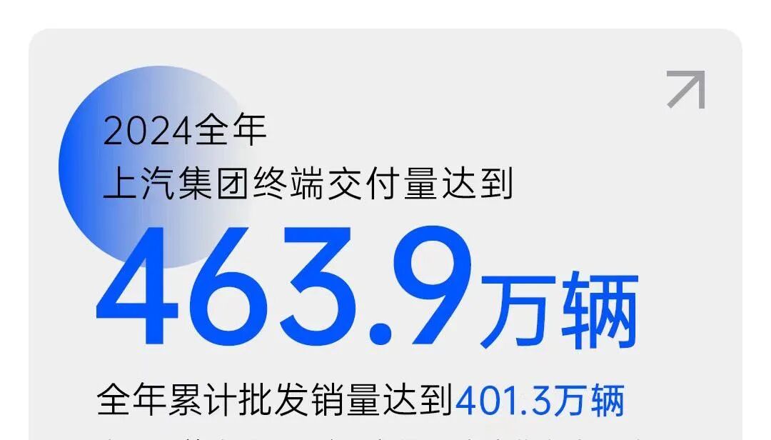 表面上来看,上汽集团用更大字号公布的2024年全年终端交付量达到了463.9万辆,似乎高于比亚迪公布的427.2万辆全年销量。但若以相同口径比较,前者在厂方产销快报中公布的全年销量仅为401.3万辆——毫无疑问,中国汽车市场的车企年度销冠已经易主。