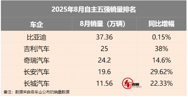 从8月份自主五强排名顺序上看,与前面几月相比并无变化,最大的变化莫过于比亚迪的增速放缓了。