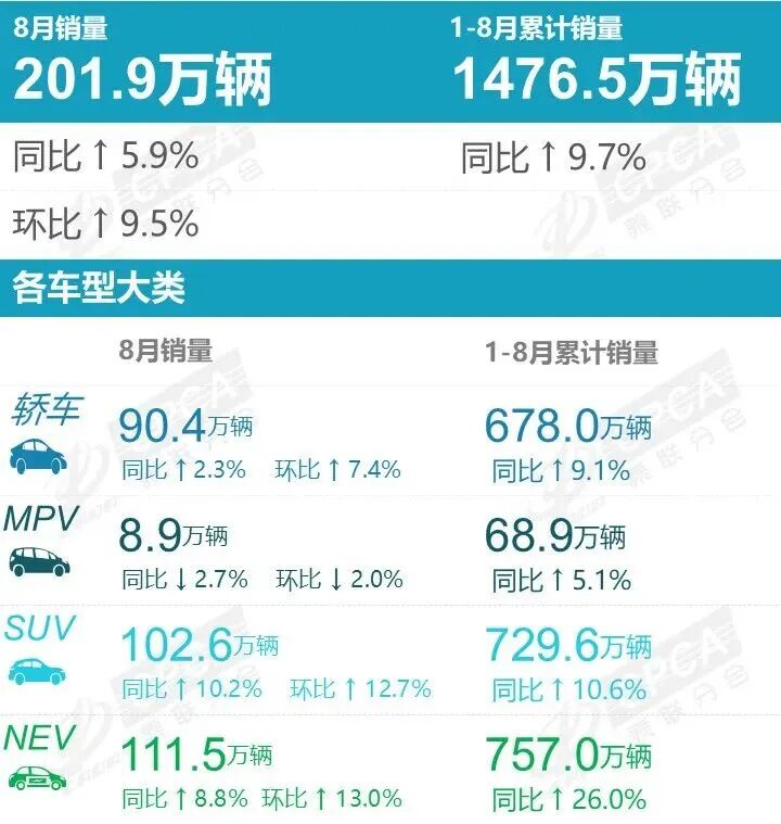 日前,据乘联会最新数据显示:8月份,国内狭义乘用车市场零售销量达201.9万辆,同比增长5.9%;1-8月份累计销量1476.5万辆,同比增长9.7%。 其中,8月份MPV销量为8.9万辆,同比下滑2.7%,环比下滑2%。相较于轿车与SUV单月销量同环比双增长的势头,MPV市场状态有点低迷。