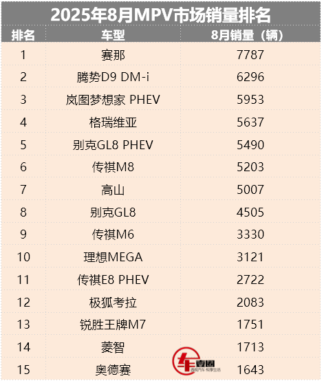 其次,格瑞维亚8月份销量5637辆,排名由7月的第8上升为第4名,有了不小的进步;别克GL8 PHEV销量5490辆,排名第5;别克GL8销量4505辆,排名第8。