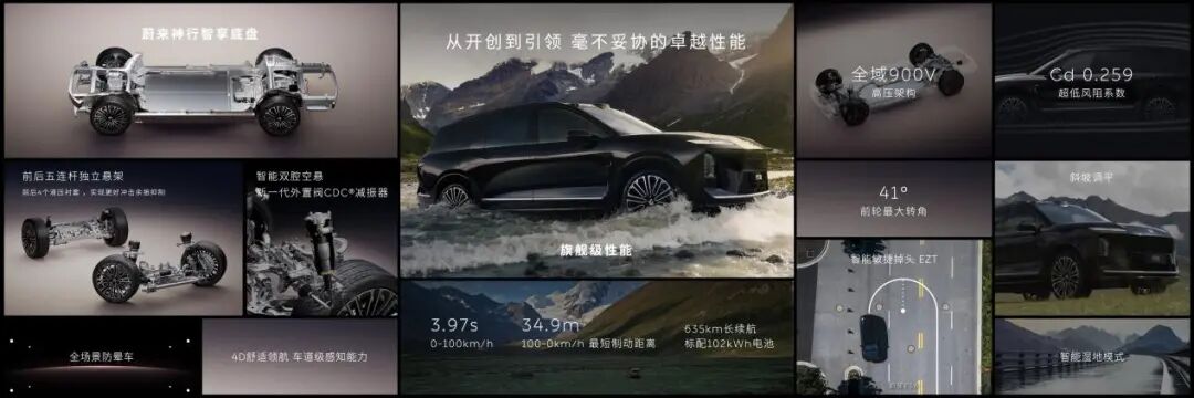 在性能方面,全新ES8搭载了蔚来最新一代全域900V高压架构,前后双电机综合功率高达520kW,峰值扭矩则为700N·m,零百加速时间仅需3.97s,性能足够强悍;同时,新车还标配102kWh电池,并拥有122处空气动力学优化,CLTC综合续航里程可达635km。