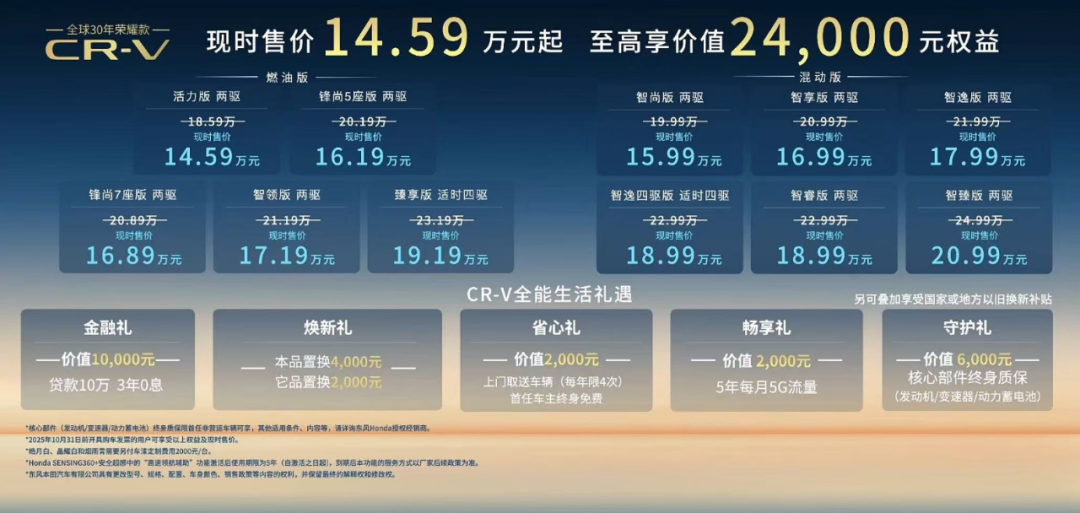 日前,东风本田CR-V全球30年荣耀款正式上市,11款车型,限时售价区间为14.59-20.99万元。