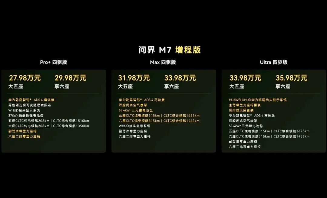 至于动力方面,全新问界M7提供增程与纯电版本,并全系标配宁德时代电池。其中,增程版可选37kWh/53kWh电池,WLTC油耗低至6.5L/100km,最高综合续航里程超1600km;纯电版全系标配华为800V高压平台和100kWh电池包,CLTC续航里程可达710km。