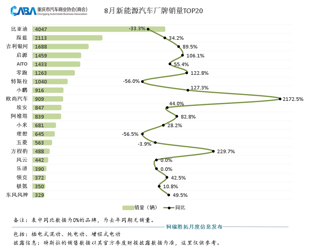 8月份,重庆新能源汽车厂牌销量TOP20前三也是缺乏悬念,继续由比亚迪、深蓝、吉利银河保持,销量分别为4047辆、2113辆、1688辆。