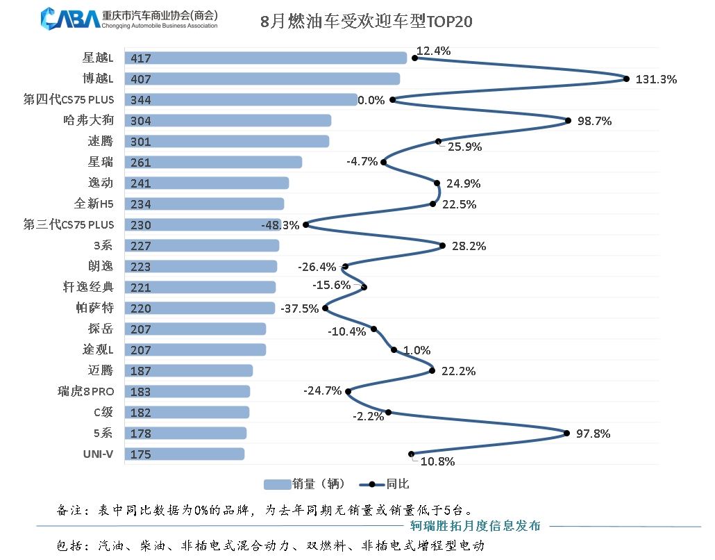 在8月份燃油车的销量TOP20中,前三的排名也与7月相同,依然是星越L、博越L、第四代CS75 PLUS,销量分别为417辆、407辆、344辆。其中,博越L销量同比增长131.3%,继续保持着强劲势头。