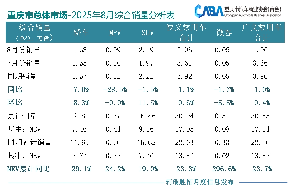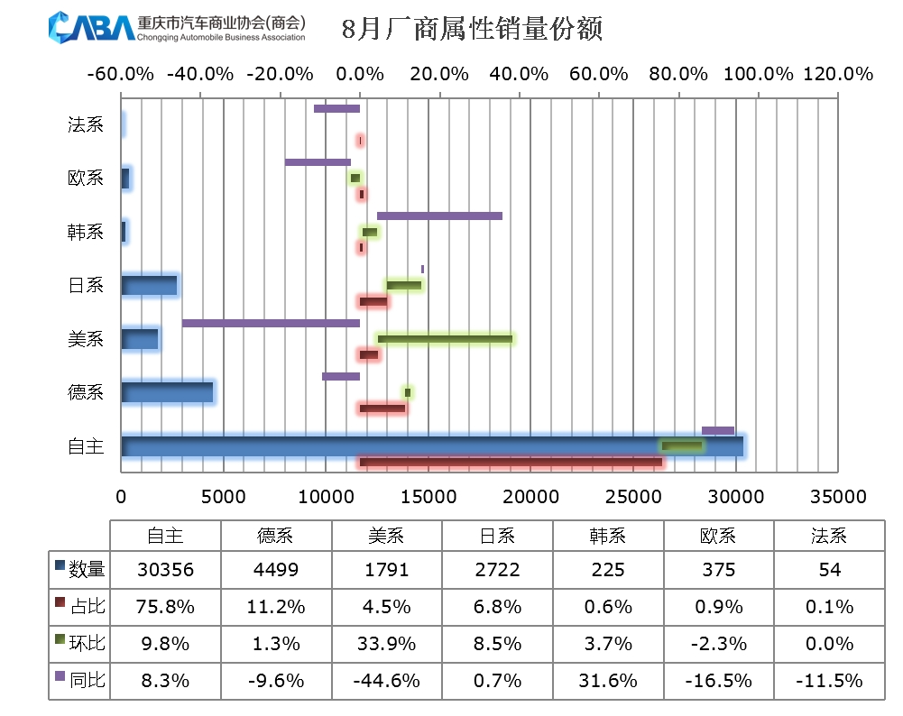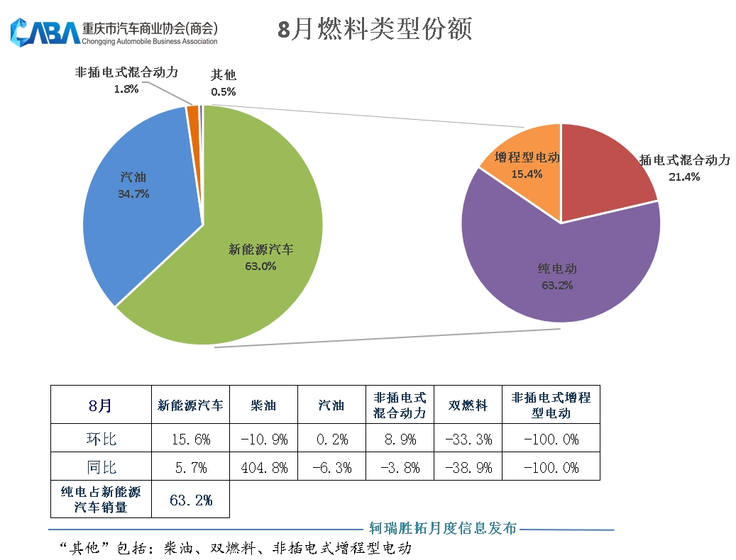 整体来看:8月份,与国内车市淡季不淡的走势相比,重庆市场也是稳中有升,尤其是新能源汽车市场占有率持续走高,继续领先行业水平。