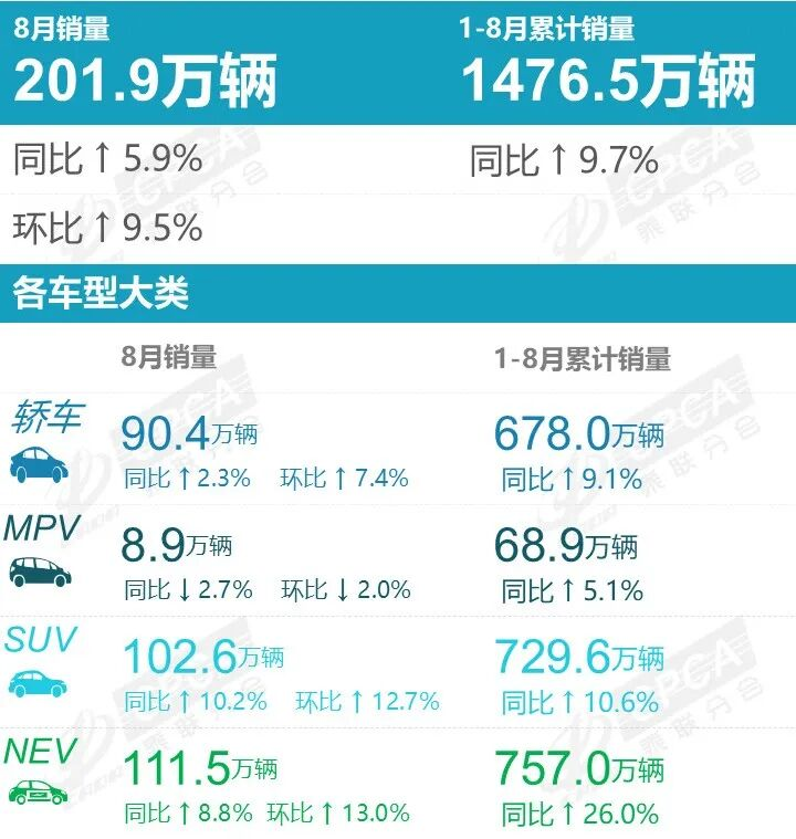 分车型来看:8月份,轿车销量90.4万辆,同比增长2.3%,环比增长7.4%;SUV销量102.6万辆,同比增长10.2%,环比增长12.7%;MPV销量8.9万辆,同比下滑2.7%,环比下滑2%。