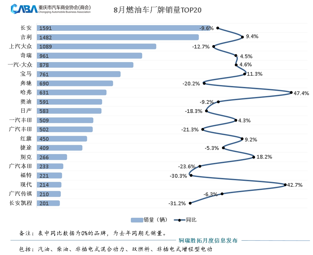 8月份,重庆燃油汽车厂牌销量前三排名与7月相同,分别是长安、吉利、上汽大众,销量则为1591辆、1482辆、1089辆。