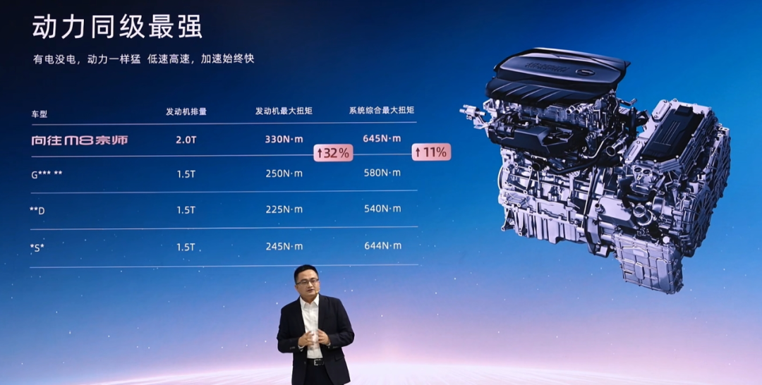 动力方面,传祺向往M8宗师搭载由2.0T发动机和电动机组成的插混系统,发动机最大功率140kW,电动机最大功率160kW,匹配2挡DHT变速箱。续航上,该车CLTC工况纯电动续航达到248km,综合续航超1200km。