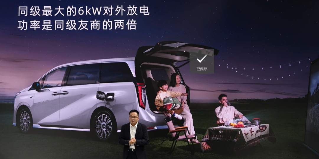另外,该车具备快充功能,SOC 30%至80%仅需14分钟,再加上全系标配6千瓦对外放电功能,进一步提升整车实用效果。