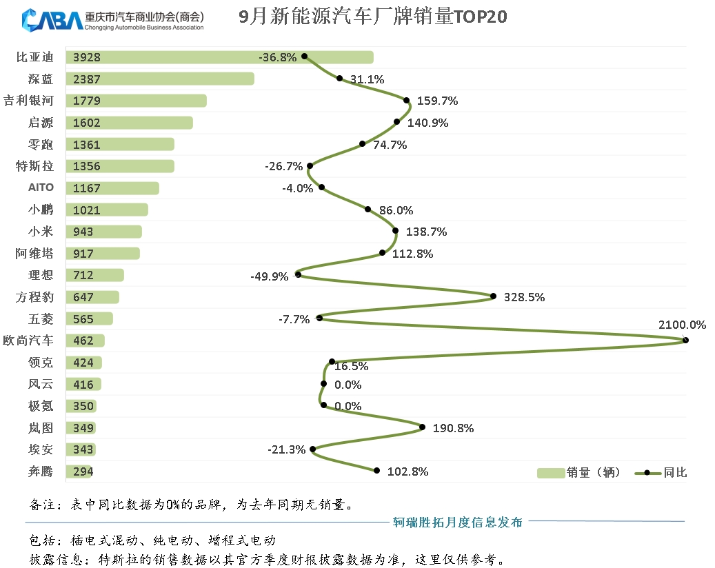 再看新能源汽车的表现:9月份,重庆新能源汽车厂牌销量TOP20前三依然是比亚迪、深蓝、吉利银河,销量分别为3928辆、2387辆、1779辆。