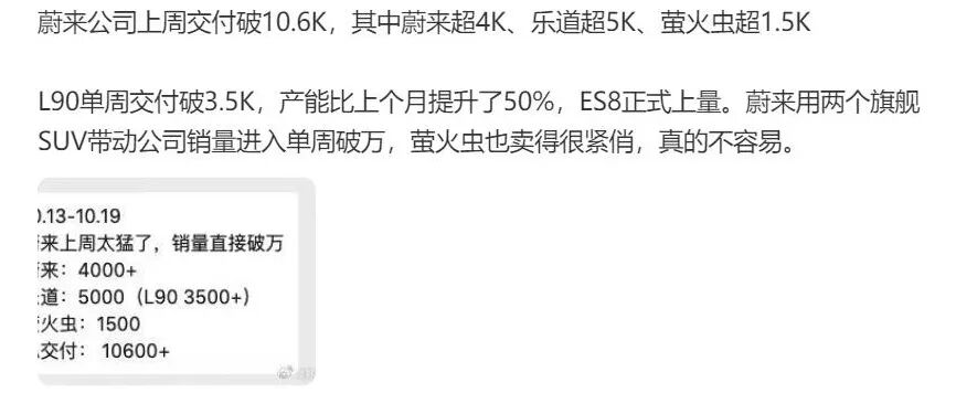 当曾经甚嚣尘上的各种“周销量榜单”在国庆长假后突然因为不可描述之缘故而迹近偃旗息鼓时,我们却于日前迎来了某汽车博主爆料:上周,蔚来公司总交付量超1.06万辆。其中,蔚来、乐道、萤火虫三大品牌的交付量分别为超4000辆、约5000辆、约1500辆。