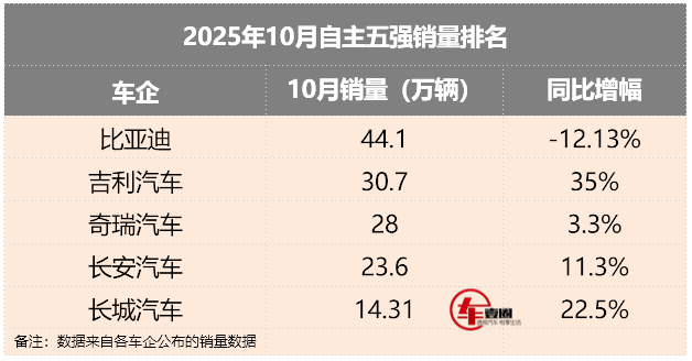 从厂家发布的数据来看:10月份,长城汽车销量14.31万辆,同比增长22.5%;1-10月,累计销量106.64万辆,同比增长9.87%——尽管与前面四家相比,长城汽车销量上有所保留。不过单车利润将近1万元,让长城汽车在自主五强中属于最会赚钱的车企了。