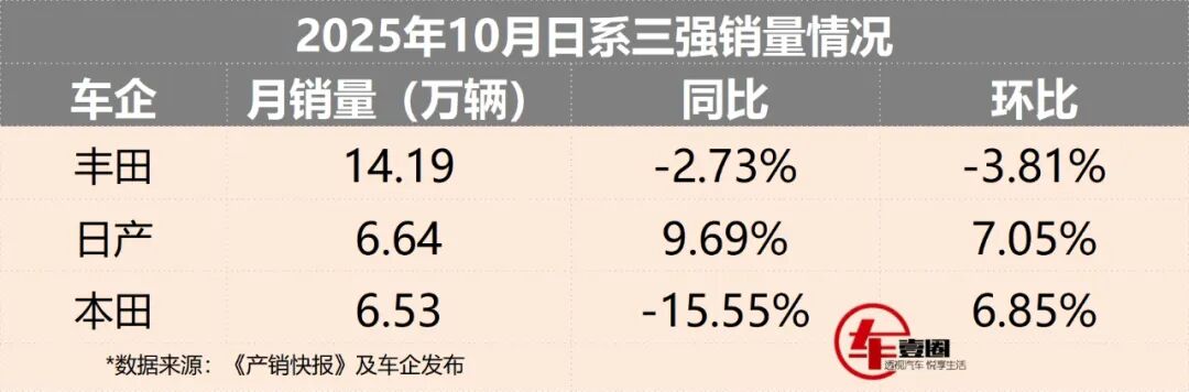 整体来看,本田旗下两家合资车企当月总销量仅6.53万辆有余,同比下滑15.55%、环比回升6.85%。即使以“总成绩”对此,该品牌同样落后于零跑(10月交付近7.03万辆)这样的“新势力”领头羊。虽近期表现略有“回暖”,但其在日系三强中仍只能继续“垫底”。