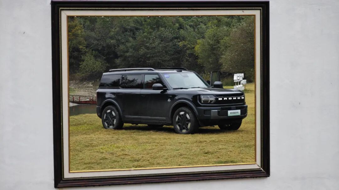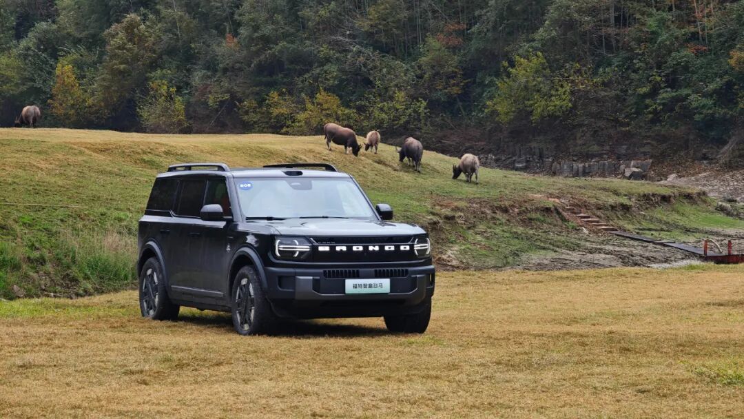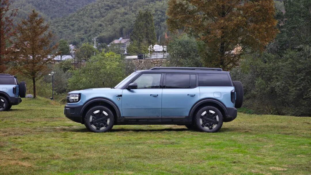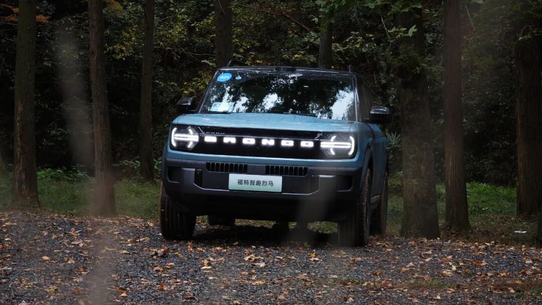 初见福特智趣烈马,便能感受到浓郁的家族式设计语言。矩形前格栅搭配复古圆形的LED大灯组,方盒子味十足;而横贯前脸的BRONCO车标,点亮后辨识度拉满,既保留了美式车型的硬朗线条,又融入了电动化时代的科技感。