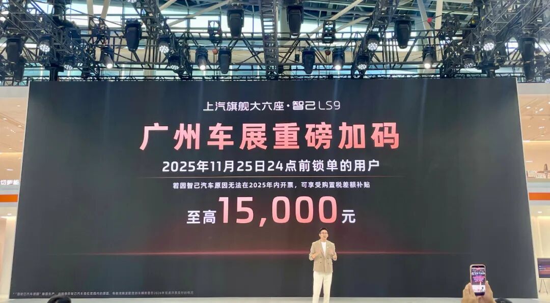 为了让有意向购买、又担心无法于年内提车的消费者放心下单,厂方还在当天的发布会现场宣布了“广州车展重磅加码”政策:凡于2025年11月25日24点前锁单智己LS9的用户,若因厂方原因无法在2025年内开票,均可享受购置税差额补贴,至高可达1.5万元。