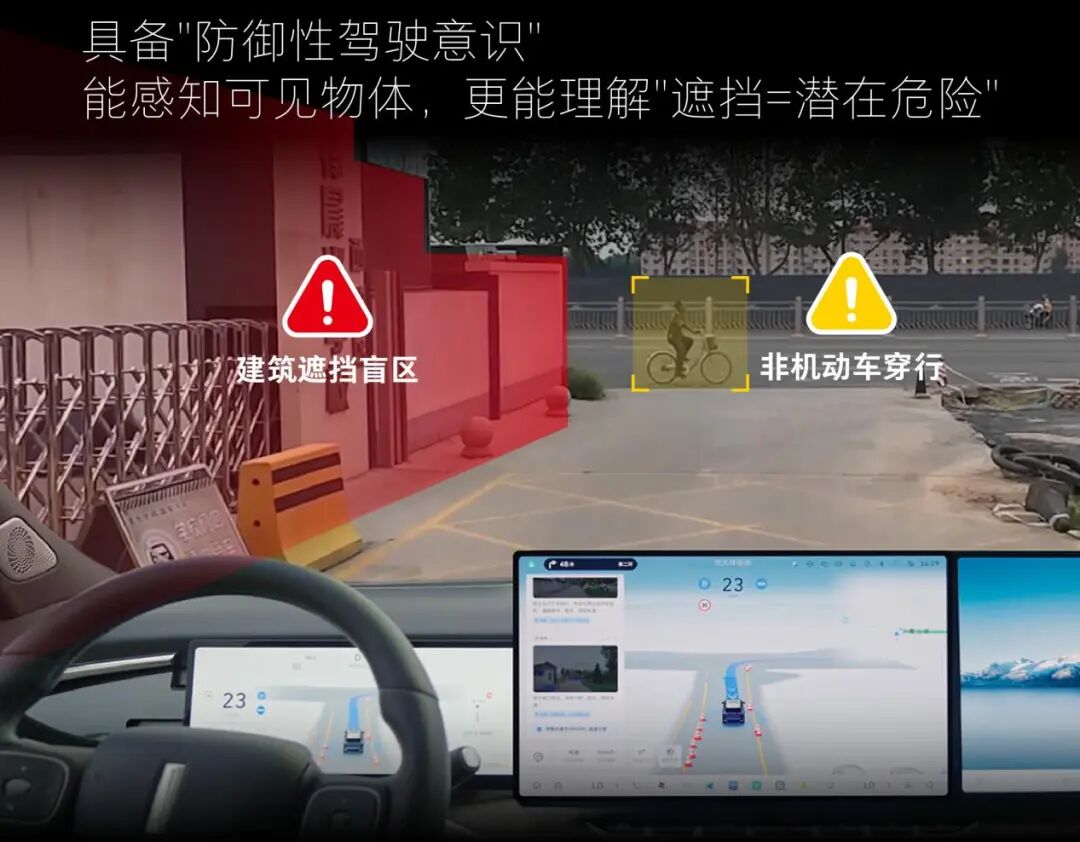 基于摄像头、雷达等传感器获取的道路信息,VLA大模型会先将其转化为可描述的语言/文字,再据此进行理解、推理,进而决定下一步将要执行的操作。也正因为如此,升级后的系统不仅能感知可见物体,更能理解“遮挡=潜在危险”,并具备“防御性驾驶意识”。