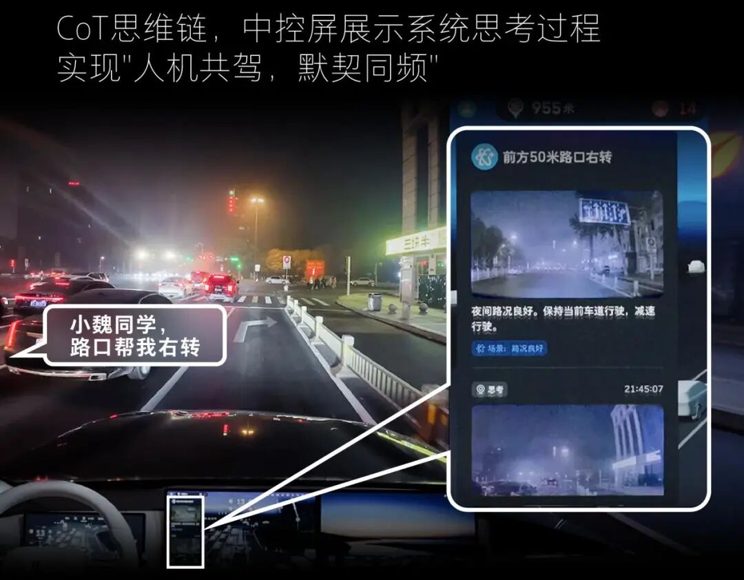 没错,这同样是VLA大模型的另一个典型特征。吴会肖与潘天鸿也在活动当天的直播中谈到:将辅助驾驶系统的“思考”过程和整个逻辑链完整展示出来,会让驾乘者在出行时更加安心;同时,这也更有利于驾驶者与车辆形成默契,进而实现“人机共驾”之理想状态。
