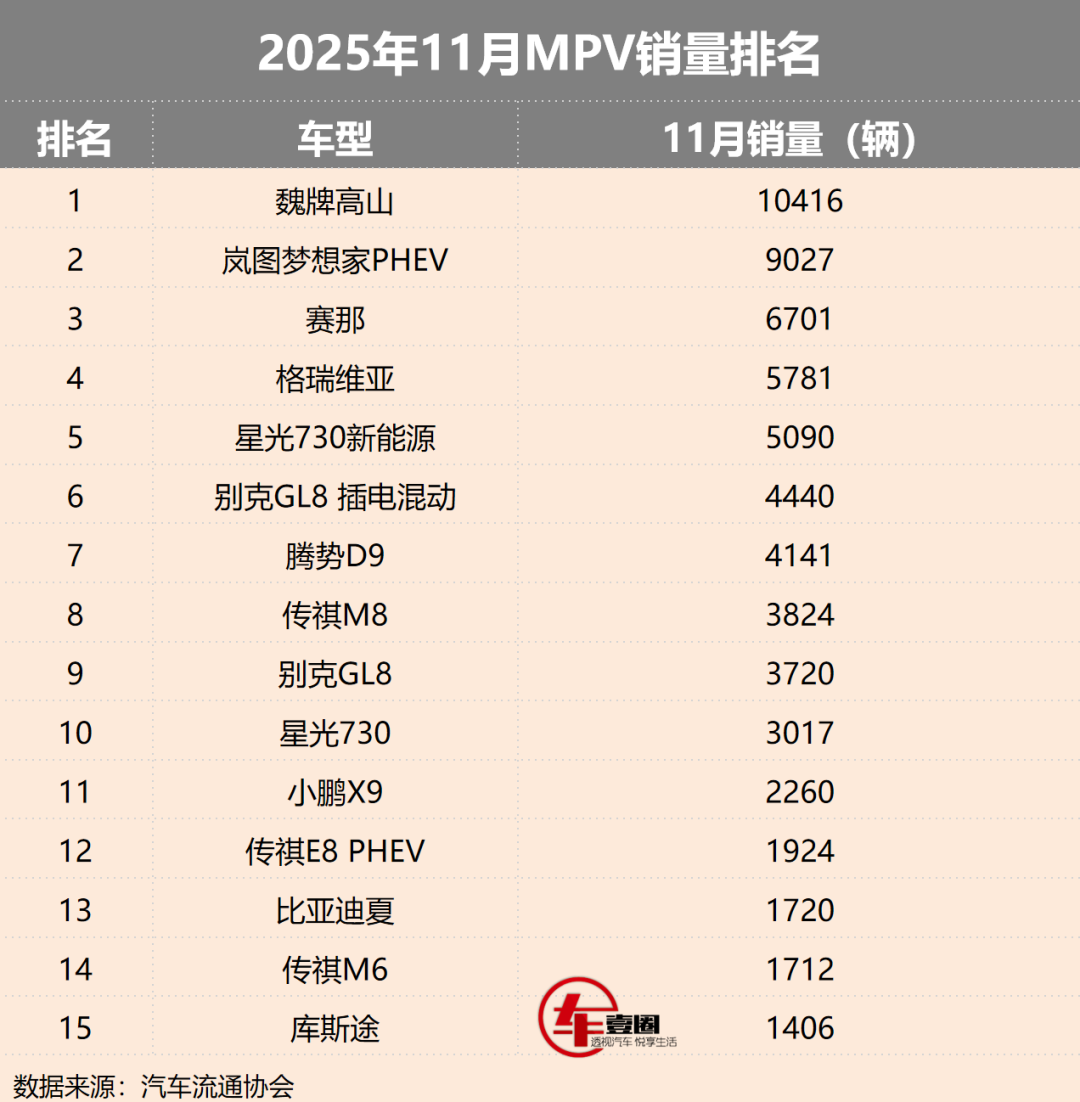 《车壹圈》观点:从11月MPV销量榜单来看,新能源车型已成为市场增长的核心引擎——岚图梦想家PHEV、别克GL8 PHEV、传祺E8 PHEV、腾势D9 、小鹏X9、星光730 PHEV等新能源车型占据榜单半数以上席位,新能源化趋势已不可逆转。