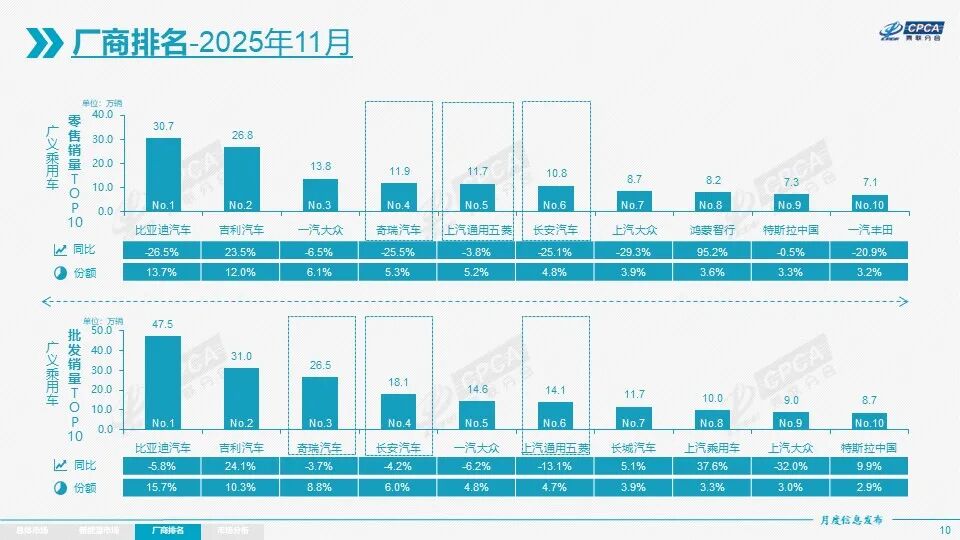 其中,比亚迪零售销量30.7万辆,同比下滑26.5%;一汽-大众销量13.8万辆,同比下滑6.5%;奇瑞汽车销量11.9万辆,同比下滑25.5%;长安汽车销量10.8万辆,同比下滑25.1%;上汽大众销量8.7万辆,同比下滑29.3%;一汽丰田销量7.1万辆,同比下滑20.9%——销量一直很坚挺的头部车企,也出现了较大幅度的同比下滑,11月的市场情况确实有点具体。