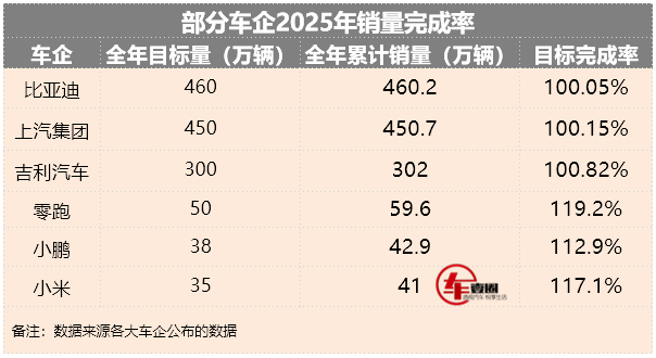 从目前来看,2025年传统大厂中只有比亚迪、上汽、吉利完成了全年目标量,其它大部分车企较年度目标尚有些距离,这也让大家对它们2026年的表现有了更多期待。