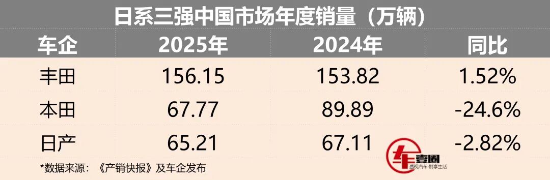 《车壹圈》观点:一番盘点后可知,即使是贵为全球车市王者、在中国市场亦拥有深厚底蕴的丰田,2025年一番忙碌后也仅有微增。再看勉强守住三强次席之本田,何时才能让人看到积极信号?至于似已找到“销量密码”的日产,则会在2026年继续向前者发起挑战。
