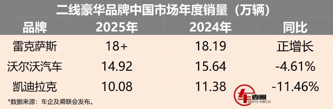 《车壹圈》观点:一番盘点后不难看出,即使是昔日曾“高高在上”、旗下车型需加价+排队的雷克萨斯,2025年在中国市场也仅能勉强保持微增。至于沃尔沃和凯迪拉克,虽然销量较2024年均有下滑,但前者的走势明显更为健康,后者却仍然让人看不到“拐点”。