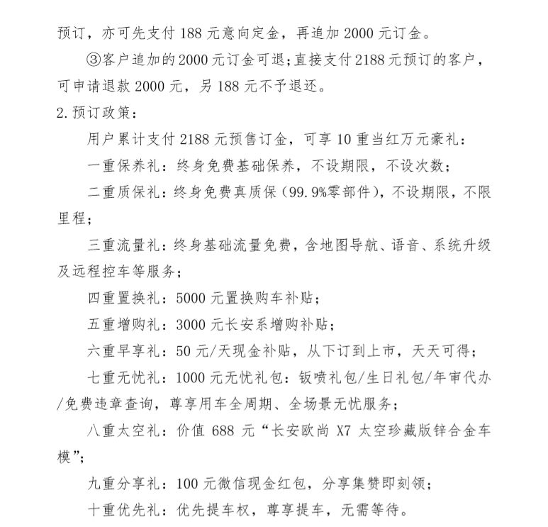 今日(9月30日),有网友在《车壹圈》后台投稿,长安欧尚X7疑似预订政策泄露,从图片上我们可以发现,用户累计支付2188元预售订金,即可享受诸如保养礼、质保礼、流量礼、置换礼、增购礼等10重豪礼(详见下图)。从预订政策来看,长安欧尚汽车可谓是下足了血本,国庆想要购车的朋友可以先等等,这样的政策在汽车圈确实很少见。