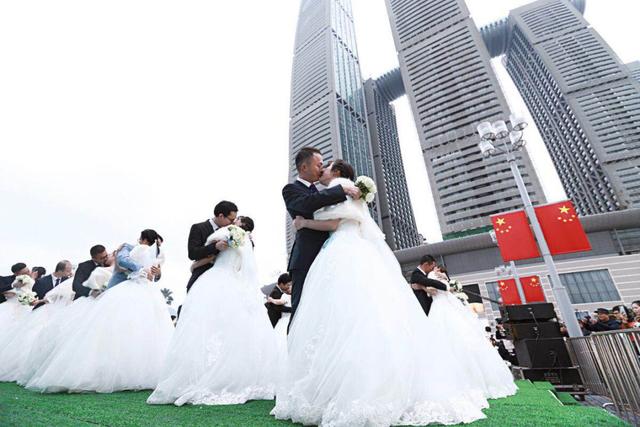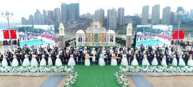 “往后余生,风雪是你,平淡是你,清贫也是你,荣华是你,心底温柔是你,目光所致,也是你......”一首马良的《往后余生》在重庆来福士对面的朝天广场响起,引得众多来来往往的游客驻足观望拍照。当然,这不是马良的个人演唱会,而是一场别样的集体婚礼。