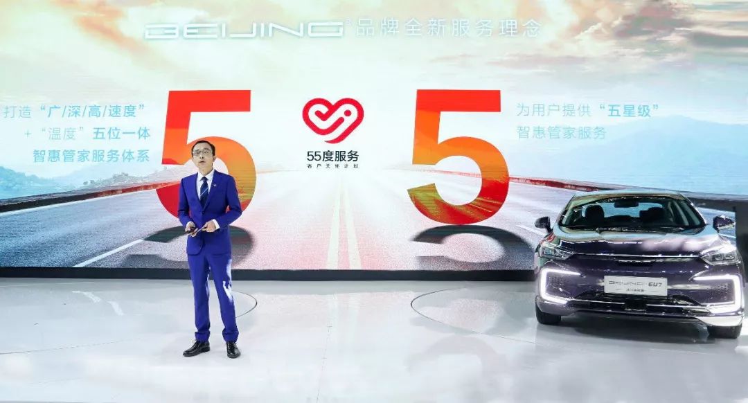 在发布会现场,BEIJING品牌正式推出了“55度服务”BEIJING品牌全新服务理念。北汽集团营销业务委员会副总经理彭友林向大家介绍到:55度服务是分为两个“5”,第一个5代表BEIJING品牌要打造“广/深/高/速度”+“温度”的五位一体服务体系;第二个“5”代表的是为用户提供“五星级”智惠管家服务。