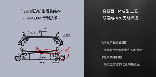 至于悬架,新车换装了Smart Expand Beam(以下简称SEB)蝶形仿生后悬架,该悬架是马自达为了实现SKYACTIV-VEHICLE ARCHTECTURE(以下简称SKY-VA)创驰蓝天车辆架构技术平台构想而专门开发的技术专利。