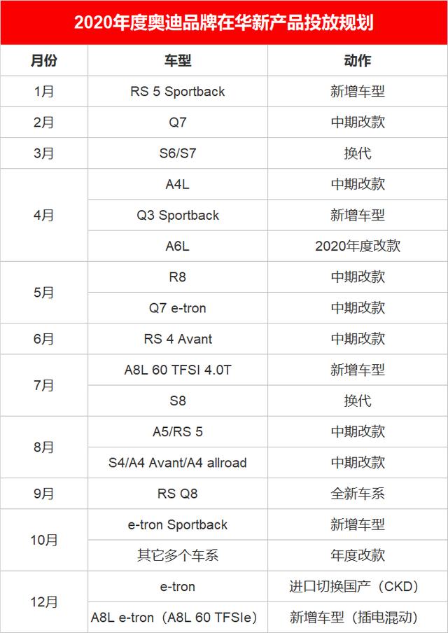 根据前不久奥迪品牌发布的2020年在华新产品投放规划,明年奥迪将在中国市场投放超过20款全新/换代/中期改款/衍生车型,从新车具体投放的时间来看,除11月份外,每月都有至少一款新车推向中国市场,将2020年看作是奥迪的产品大年也丝毫不为过。
