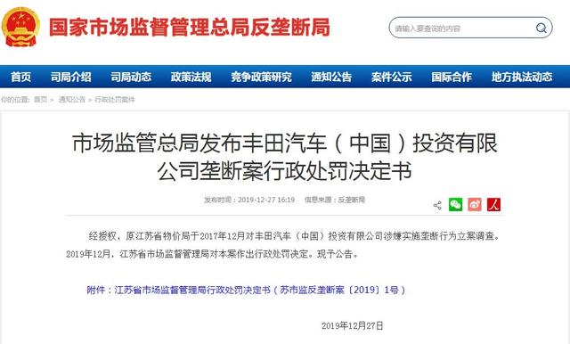 而就在日前,国家市场监督管理总局反垄断局发布《丰田汽车(中国)投资有限公司垄断案行政处罚决定书》,对其在雷克萨斯品牌汽车销售中存在的价格垄断违法行为进行处罚。据悉,调查始于2017年,国家市场监督管理总局反垄断局对丰田方面处以其上一年度(2016年度)销售额2%的罚款,约8761万元。