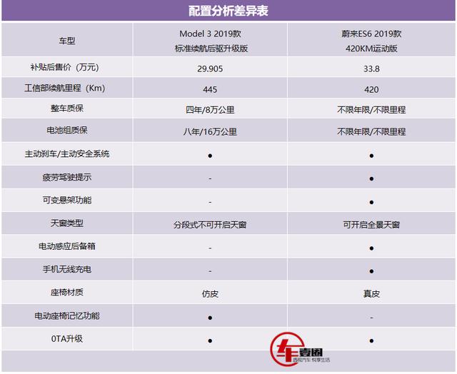 从续航来看,这个价位的两款车相差其实并不大,都在400km以上,并且百公里加速时间都在5.6秒,不存在哪个性能孰强孰弱。而其他配置方面,像真皮座椅、全景天窗、电动感应后备箱等国内消费者喜欢的配置在国产Model 3身上并找不到。更关键的是,蔚来ES6整车/电池组质保都是不限年限/不限里程的,完全解除了消费者的后顾之忧。