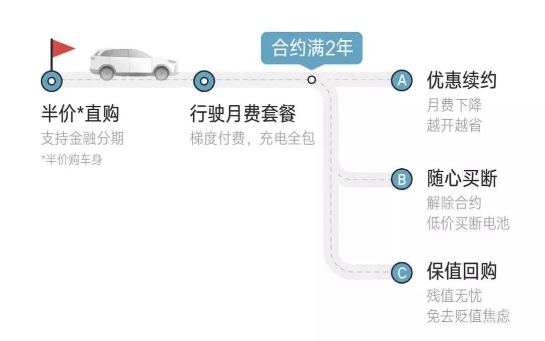 最后,在2年合约到期之后,消费者可以选择优惠续约(月费下降)、随心买断(解除合约、买断电池)、保值回购(6折回购)这三种之一。
