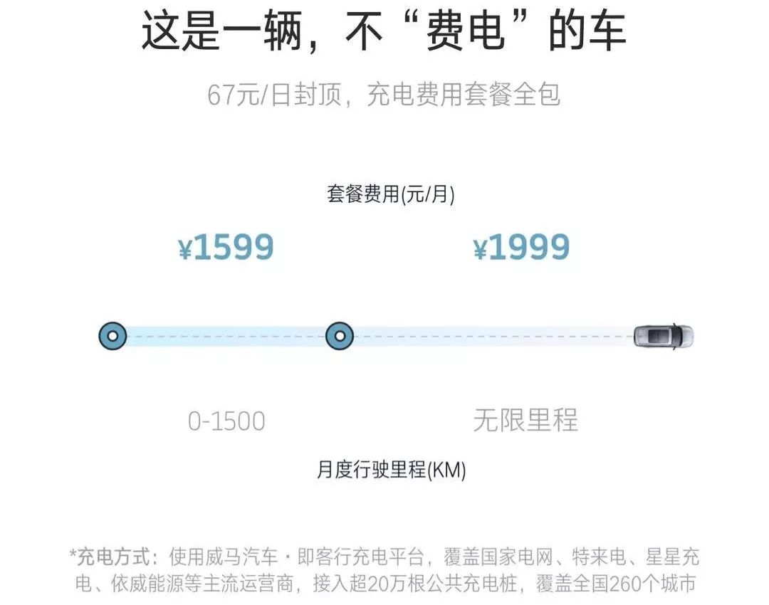 在买车之后,消费者必须与官方签订两年的合约,即“行驶月费套餐”。从官方来看,这个2年的合约套餐根据消费者的行驶里程又划分了2个梯度。第一个,月行驶1500公里之内,为1599元/月;第二个,无限里程则为1999元/月。比较有意思的是,这个月费包含了使用期间所有的充电费用。