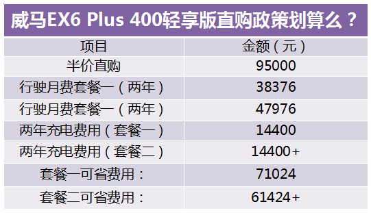 近日,《车壹圈》从威马汽车官方获悉,针对旗下威马EX6 Plus 400轻享版推出了“威马直购”政策,即官方半价,合约套餐1599元起,2年6折保值回购。简单一看,消费者可以以半价的优惠价格购买威马EX6 Plus 400轻享版。是不是看起来非常诱人?那么,这笔买卖真的划算么?
