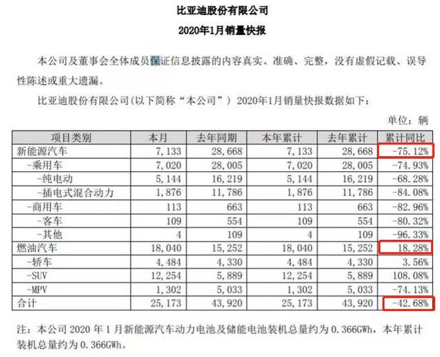 日前,《车壹圈》从比亚迪官方获悉,今年1月,比亚迪汽车累计销量为25173辆,同比下滑42.68%,其中,新能源汽车销售7133辆,同比下降75.12%;而燃油汽车却实现逆市上扬,上月销售18040辆,同比增长18.28%。