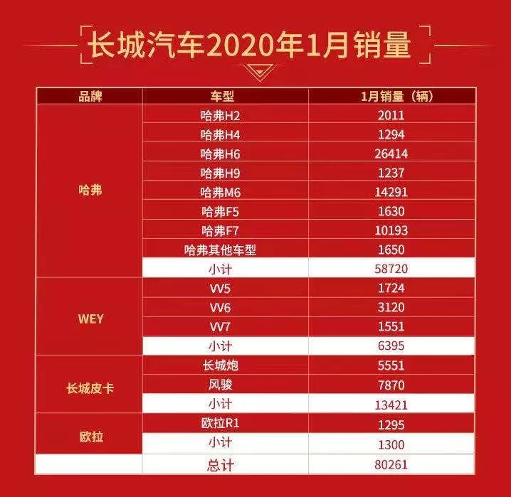 具体来看,哈弗品牌1月销量达58720辆,连续10年稳居中国SUV市场销量冠军。其中,哈弗H6 1月销量达26414辆,累计80个月位居SUV月度销量冠军。