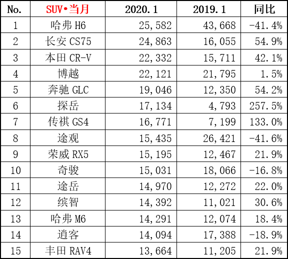 近日,乘联会对外公布了2020年1月综合销量排名快报。数据显示,1月份SUV销量80.4万辆,同比下降14.5%,环比下降18.8%。从榜单上我们可以发现,榜单排名变化明显,新老面孔迭代加快;大部分榜单车型销量同比都出现了不同程度的增长,车市“马太效应”越加明显。下面,就跟随圈哥来进一步了解榜单的情况吧!