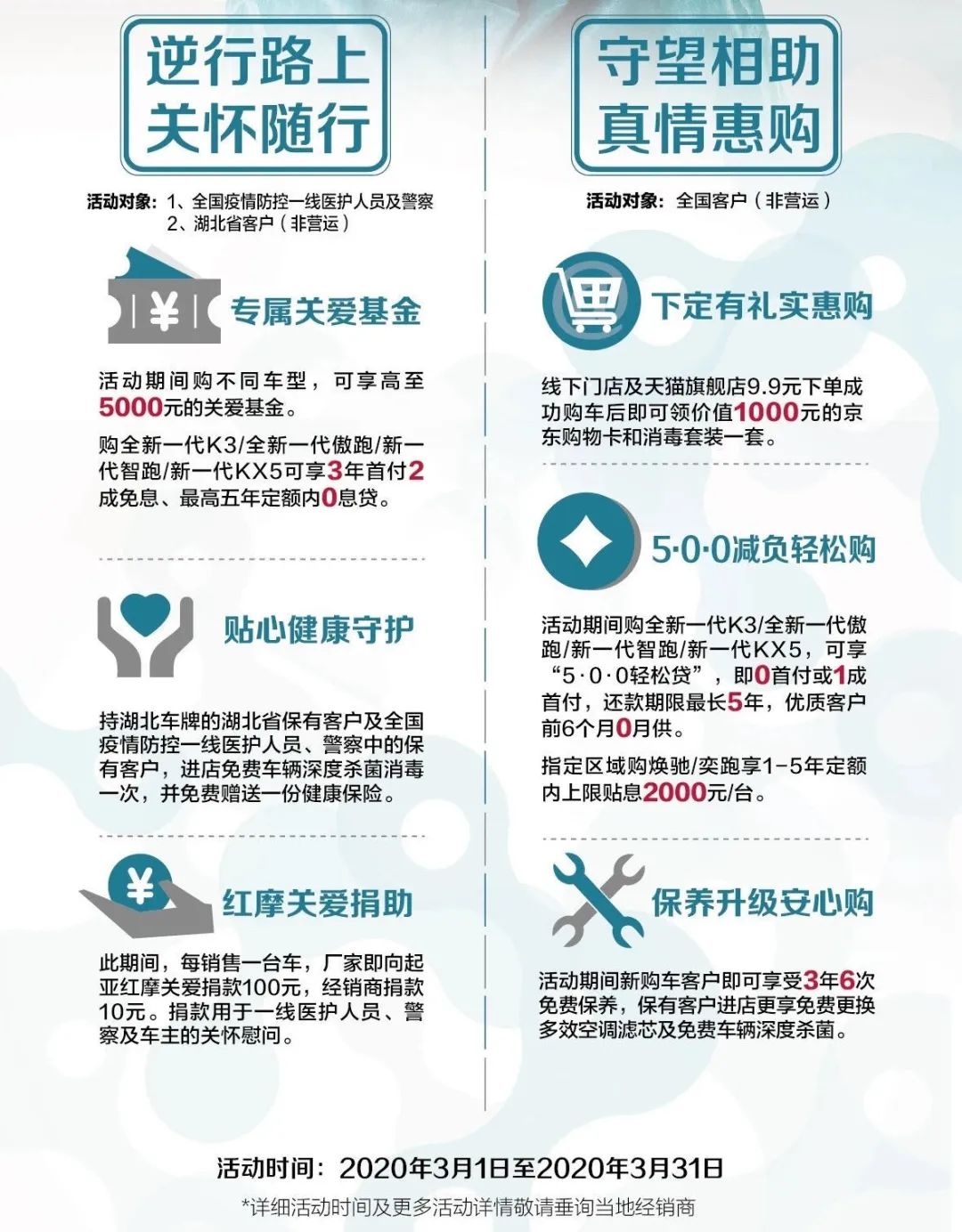 当然,关爱远不止于此。对于一线人员和湖北地区用户购车,凡购买东风悦达起亚旗下车型,最高可享5000元的“关爱礼遇”。旗下四款热销车型(全新一代傲跑、全新一代K3、新一代智跑、新一代KX5)3年首付20%即可免息,最高享受5年定额内免息,金融政策也是相当的到位。